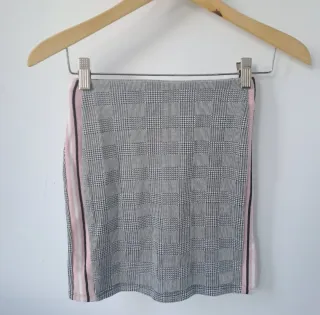 Falda elástica de corte recto con estampado de cuadros y detalle de raya lateral en color rosa, blanco y negro. Marca Pull&Bear talla XS. #combinaloconmascositasdemiperfil #prendasdediferentestallasenmiperfil