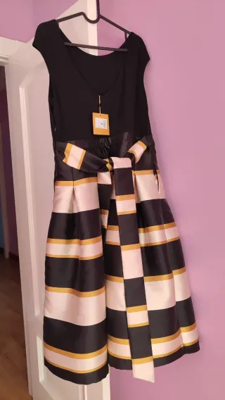 Elegante vestido de fiesta de la marca Woman Fiesta, ideal para eventos especiales. Presenta un diseño con cuerpo negro y falda a rayas. - Cuerpo de manga corta. - Falda con estampado de rayas en negro, blanco roto y detalles dorados. - Cinturón de tela a juego anudado en la cintura. Vendido por El Corte Inglés por 190€. A estrenar. Totalmente nuevo.