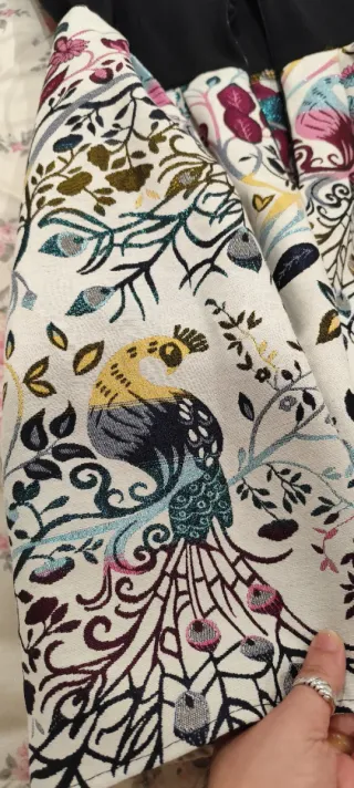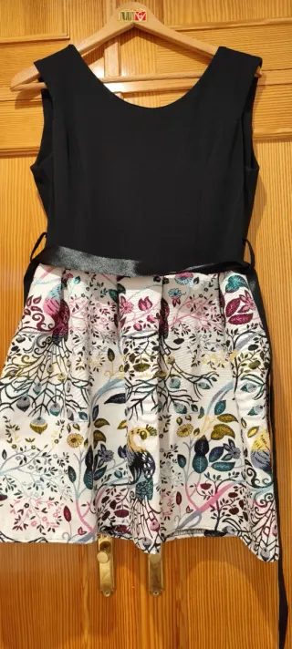 Vestido corto con un diseño vibrante y elegante, perfecto para ocasiones especiales. La parte superior es de color negro liso, mientras que la falda presenta un estampado detallado de aves y follaje en tonos multicolor. - Talla S/M. - Diseño sin mangas. - Cintura marcada con cinta de satén. - Falda con vuelo y estampado de aves y flores.
