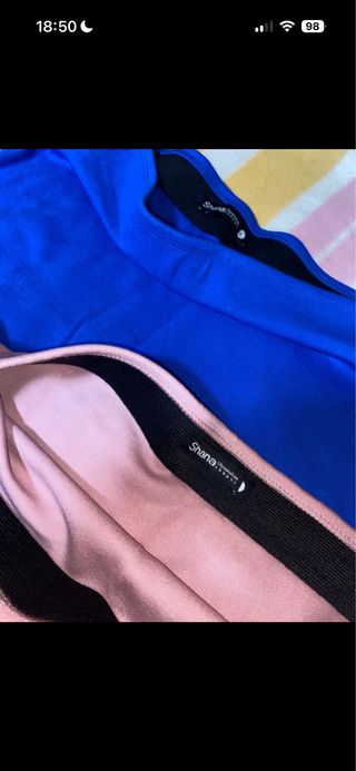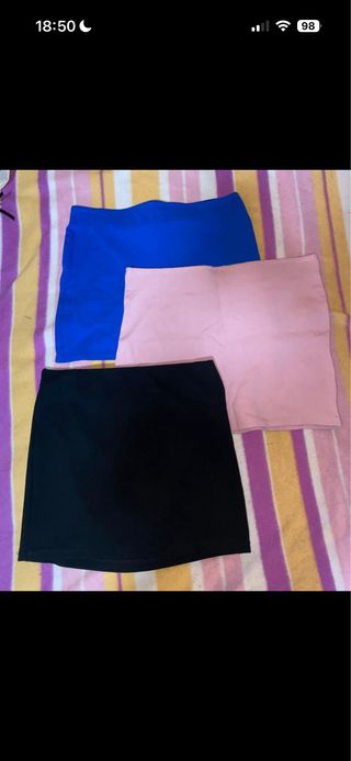 Conjunto de tres faldas cortas. - Una falda de color azul vibrante. - Una falda en tono rosa suave. - Una falda clásica en color negro.