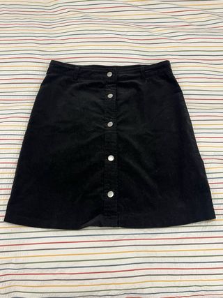 Falda corta de color negro, tela sueve y botones de arriba a bajo Medidas Contura: 44cm Parte media 63cm Parte Baja/borde 88cm Largo 44cm Usada un par de veces, sin manchas ji marcas o roturas - Cierre de botones frontales. - Cintura elástica. - Corte acampanado.