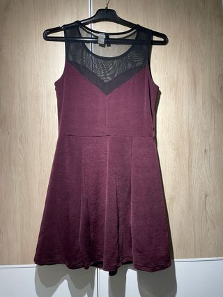 Vestido corto granate con transparencias negras