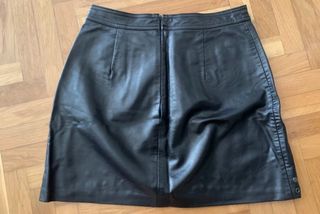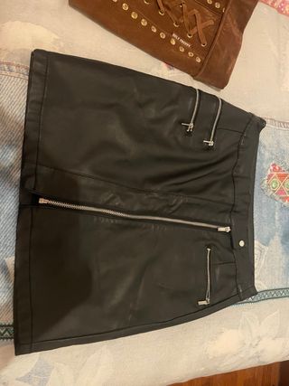 Falda corta de cuero sintético con un diseño moderno. - Cierre frontal con cremallera. - Dos bolsillos delanteros con solapa. - Detalle de anilla en la cremallera. Nueva a estrenar, la vendo por no ser mi talla y no poder descambiar.