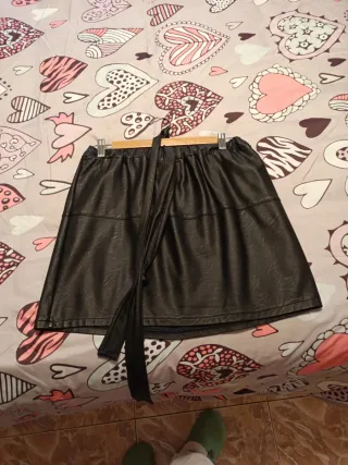 Falda de talla alta de cuero sintético. Es elástica, equivale a una XS