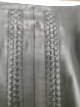 Elegante falda de cuero con un diseño único. - Material: Cuero - Color: Negro - Detalle de trenzado en los laterales y bajo. - Abertura frontal.