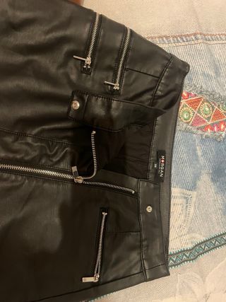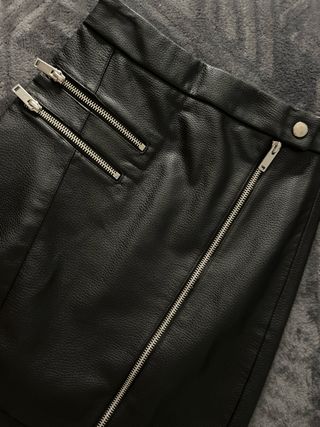 Falda negra tipo cuero con diseño moderno y dos cremalleras decorativas en la parte frontal. Corte recto, tejido con efecto piel y cierre central de cremallera. Combina genial con looks casuales o más cañeros. Talla S.