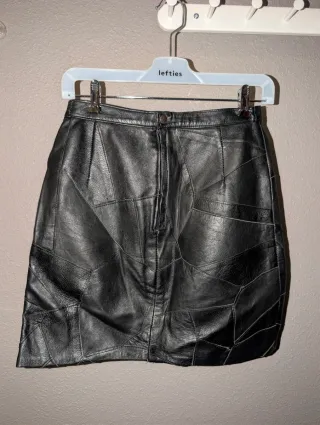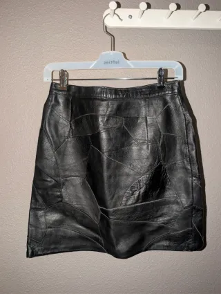 Falda de cuero negra con un diseño patchwork único. - Material: Cuero - Diseño: Patchwork - Color: Negro - como nueva