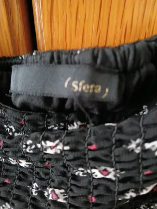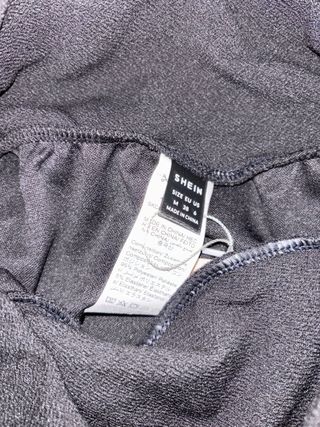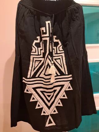 - Vestido negro con tirantes finos, escote en pico y diseño de corte holgado con dos capas. Talle M. - Falda de jean. Talle S. - Leggings de ecocuero BERSHKA. Talle M. - Short de algodón estampado con elástico y espejitos de colores. SIN USO. Talle M.