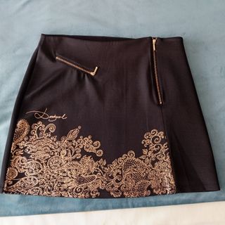 Falda elástica, negra y dorada, ligera y cómoda, con cintura un poco baja. En la parte delantera tiene: falso bolsillo con cremallera de 12 cm que se abre y una apertura lateral con cremallera de 20 cm. En la parte posterior tiene dos pinzas. Prácticamente nueva. Medidas tomadas en plano: cintura 42 cm, contorno de cintura 84 cm. En su parte inferior la medida de ancho es 56 cm, contorno 112 cm. Largo: Por delante 44 cm, por detrás 46 cm, en su parte En su parte más ancha la medida es 49 cm. Talla: L. Marca: Desigual