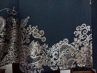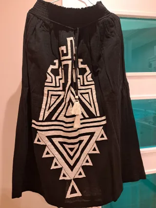 Falda larga con un diseño étnico en blanco sobre fondo negro. La cintura es elástica y tiene un cordón ajustable con detalle de borla. - Diseño de bordado geométrico. - Cintura elástica con cordón. - Detalle de borla.