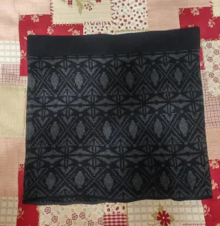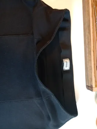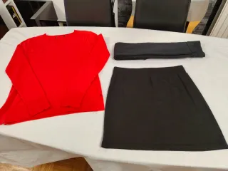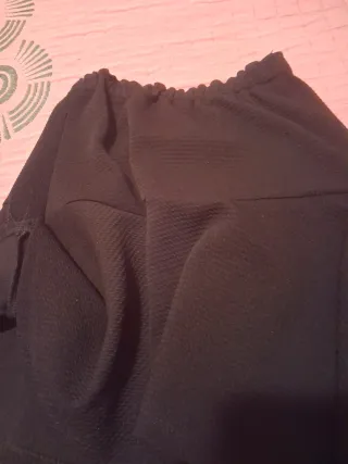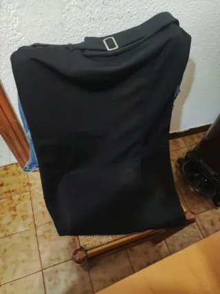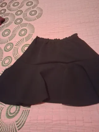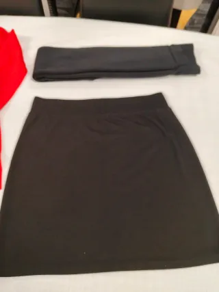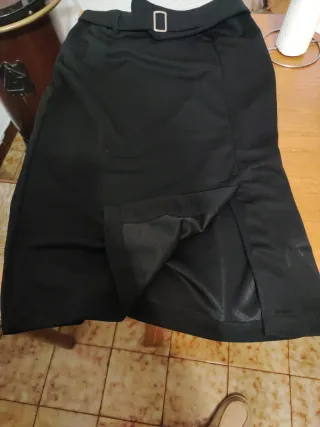 Falda negra lisa. Usada en una ocasión. Talla 42 como 40 de Easy Wear de El Corte Inglés. La falda en la zona de la cintura tiene la marquita de la percha pero no se nota. Cintura mide 37 y cede hasta 49 y de largo tiene 42. Es un algodón elástico. Medias térmicas sin pies una puesta de Primark. Regalo jersey.