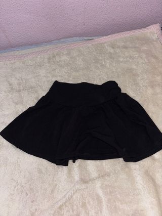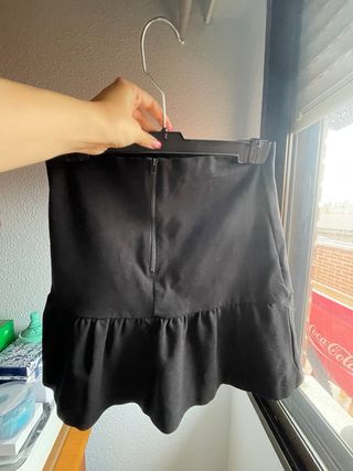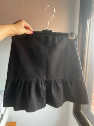 Falda corta negra con un diseño moderno y femenino. Perfecta para combinar con diferentes estilos. - Detalle de volantes en el bajo. - Cintura elástica para mayor comodidad.