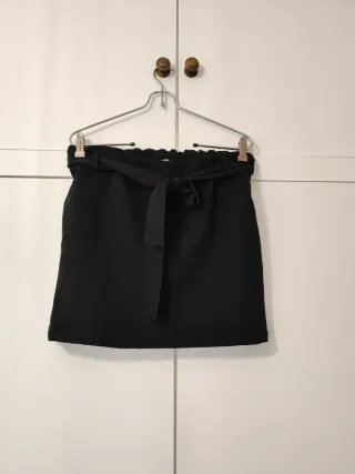 Falda corta de color negro con cinturón. - Cintura con elástico y cinturón anudado. - Diseño liso y elegante.