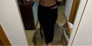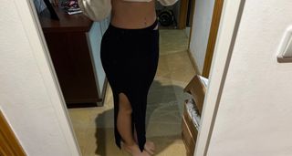 Falda larga de color negro con un diseño moderno y elegante. - Abertura lateral pronunciada. - Corte ajustado que realza la figura. - muy elastica