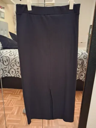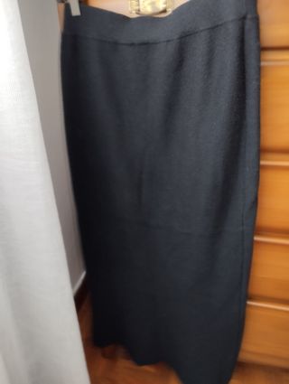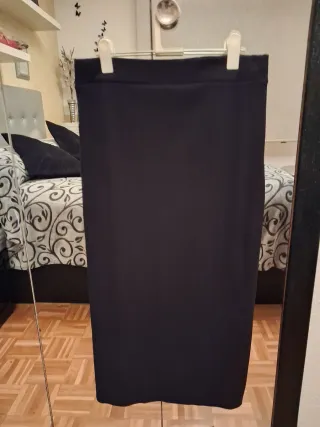 Falda larga de tubo negra con cintura ajustable. - Diseño elegante y versátil. - Tejido cómodo y adaptable. -Talla L, da de sí. -Abertura trasera. -Es de tejido elástico. -Se adapta al cuerpo.