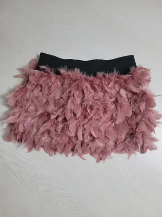 Falda corta con un diseño llamativo de plumas negras. - Usada solo una vez. - Cintura elástica. - Adorno de plumas en toda la prenda.