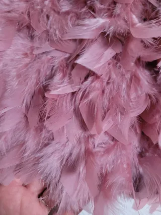Falda corta de plumas, ideal para eventos y fiestas. - Cintura elástica negra. - Adorno de plumas rosas.