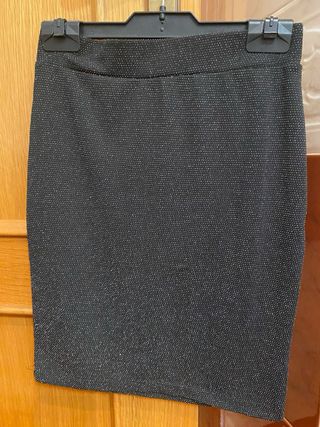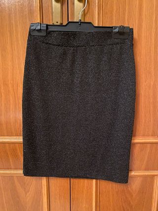 Elegante falda tubo de corte recto, ideal para ocasiones especiales o para darle un toque sofisticado a tu look. - Tejido con detalles plateados. - Cintura elástica para mayor comodidad.