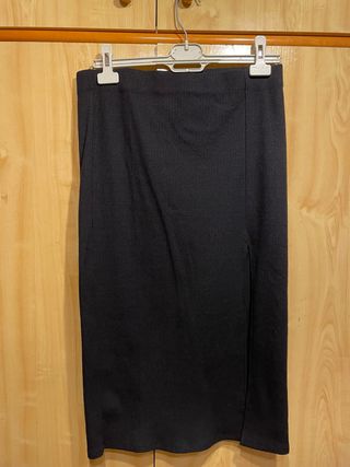 Falda midi de canalé en color negro. Presenta una abertura lateral. Sin estrenar, conserva la etiqueta. - Tejido elástico. - Diseño de canalé. - Abertura lateral.