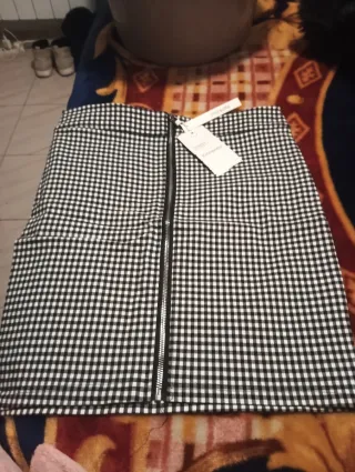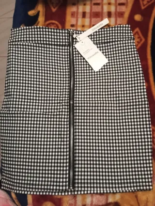 Falda elástica con estampado de cuadros y cremallera frontal. - Diseño de cuadros blanco y negro. - Cremallera completa en la parte delantera.