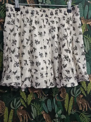 Falda corta con estampado de flores blancas sobre fondo negro. Tiene un corte vuelo y cintura elástica. Medidas: ancho 33cm, largo 42cm. Talla XS ¡Como nueva! - Diseño floral. - Cintura elástica. - Corte vuelo.