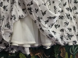 Falda corta con un bonito estampado floral sobre fondo blanco. La cintura es elástica para mayor comodidad. - Diseño de flores negras. - Cintura elástica fruncida. - Bajo con volante.