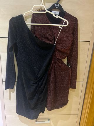 Dos vestidos de fiesta, de punto elástico con brillos, ambos con falda mini. Uno negro con una manga larga y hombro al aire. Otro granate con mangas largas, ojal en el pecho y falda separada a modo de trikini. La falda va forrada. Cada uno por 7€, y los dos por 12€.