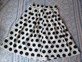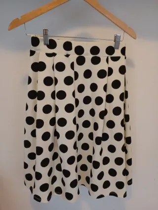 Falda con estampado de lunares, preciosa también al tacto - Medidas: cintura 34cm (ampliable ya que tiene goma elástica), largo 59 cm - Diseño de lunares negros sobre fondo blanco. - Largo hasta la rodilla.