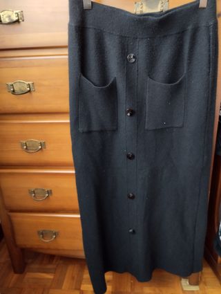 Falda de punto larga con un diseño grueso y cómodo. - Cintura elástica. - Bolsillos delanteros. - Cierre de botones.