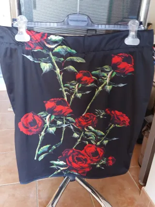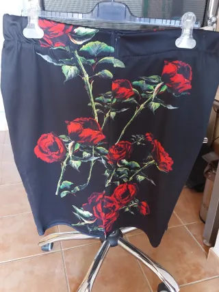 Falda con un llamativo estampado de rosas rojas sobre fondo negro. - Diseño floral vibrante. - Talle alto. - Tejido elástico para mayor comodidad. - Superiores trasera y cremallera - Medidas: 90 cm cintura, 56cm de largo