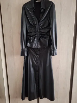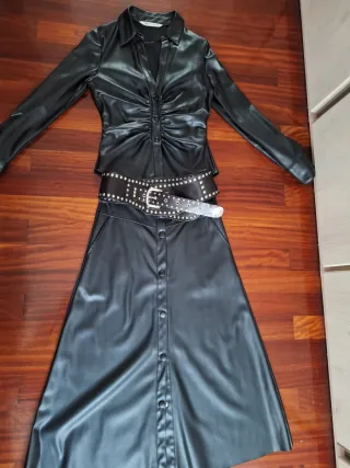Conjunto de camisa y falda de polipiel. - Camisa con detalle fruncido y botones. - Falda larga con botones y bolsillos, sienta espectacular -la camisa es de zara talla xs y es elástica - la falda es de La vie en rose y es una talla S