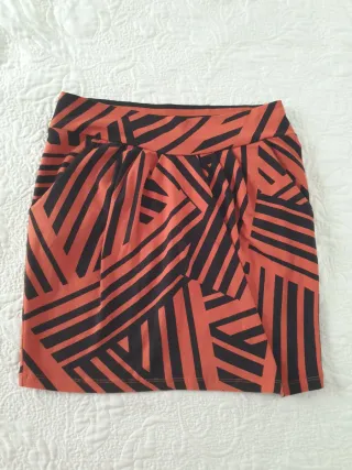 Falda estampado geométrico en tonos naranja y negro. Cintura elástica. - Bolsillos laterales. Es M pero sirve pa s/m