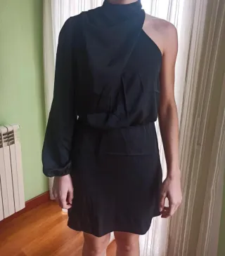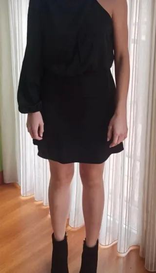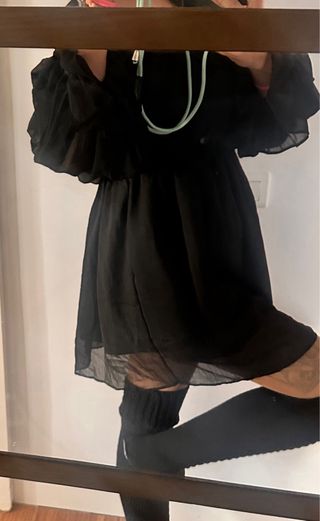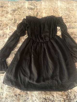 Más cosas en mi perfil 😊 Vestido negro LONDINENSE, MARCA BUENA NO ES CHINO con diseño escotado y mangas largas. - Escote elástico. - Mangas abullonadas. - Cintura elástica. - Falda con vuelo.