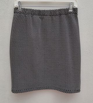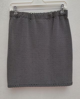 Falda de corte casual con un diseño de lunares. - Estampado de lunares blancos sobre fondo negro. - Cintura elástica para mayor comodidad. - Tejido: Poliéster y elastano. - Talla: 44 / XXL. - Medidas: 47 cm. largo y 34-46 cm. cintura (con elástico). - Estado: como nuevo, poco uso (2-3 veces).