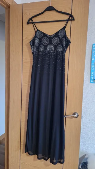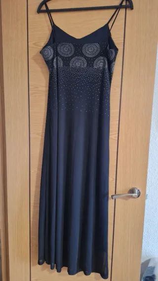 Elegante vestido largo de fiesta en color negro, con detalles plateados. - Diseño con tirantes finos. - Cuerpo adornado con pedrería y círculos. Elastico - Falda larga y fluida. - Bajo con acabado festoneado.