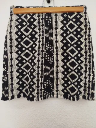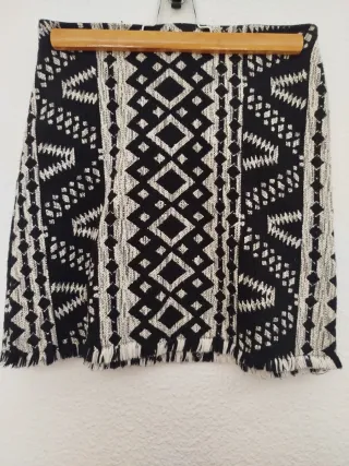 Falda corta con estampado geométrico en blanco y negro. - Diseño con flecos en el bajo. - Tejido con textura. - Está en perfecto estado. - Es elástica, se adapta bien.