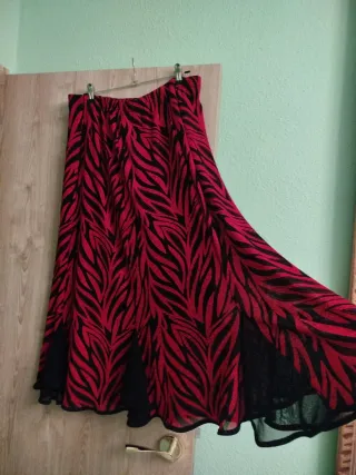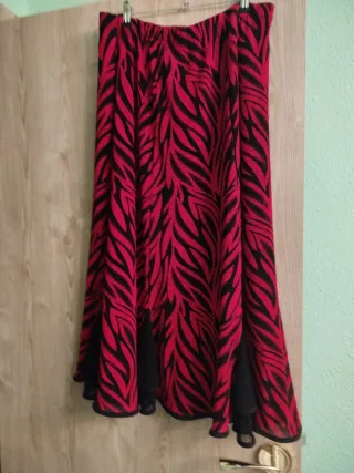 Una Falda 7€ Dos faldas 10€ Las dos con forro Falda larga con un llamativo estampado negro y rojo - Corte amplio y fluido. - Detalle de volantes en el bajo. - cintura elástica talla 46/48 Otra monocolor en rojo Cremallera oculta Con detalles de cintas Talla 46 Nota La aplicación obliga a poner una marca, sino no puedo subirlo