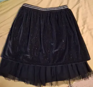 Falda de dos capas con un diseño elegante y festivo. - Capa superior de terciopelo azul con detalles brillantes. - Capa inferior de tul negro. - Cintura elástica con detalles plateados. Talla 16