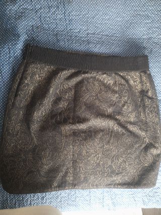 Falda tubo, tela elástica, dorada y negra con pequeña abertura en la parte de atrás. 2 posturas