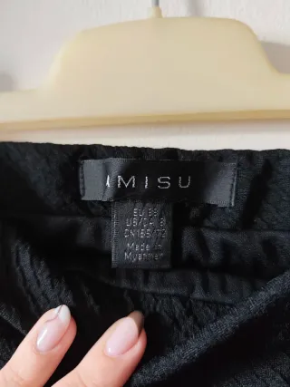 Falda corta con hilo metalizado, frunces en el centro y en los laterales y goma en la parte superior. Color negro. Estado impecable. Se ajusta al cuerpo debido a su elasticidad Composición: 76% poliester 24% hilo metalizado MEDIDAS: Largo: 38 cm. Ancho cintura: 33 cm
