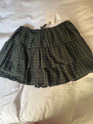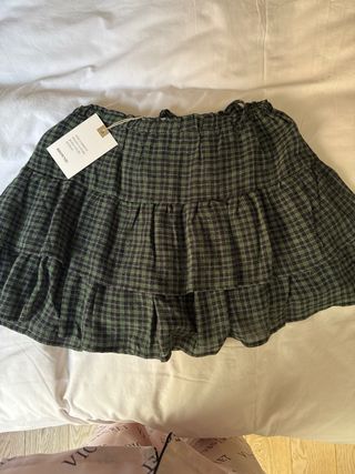 Falda de cuadros de la marca Brownie. - Diseño de volantes. - Cintura elástica con cordón. - Estampado de cuadros verdes y negros.