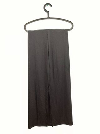 Falda negra sencilla, con goma en la cintura para mayor sujeción. Es muy cómoda de llevar y elástica, no es hiperpegada al cuerpo. Yo mido 1,56 y me queda 4 dedos por encima de la rodilla. Tiene poco uso y está en perfecto estado.