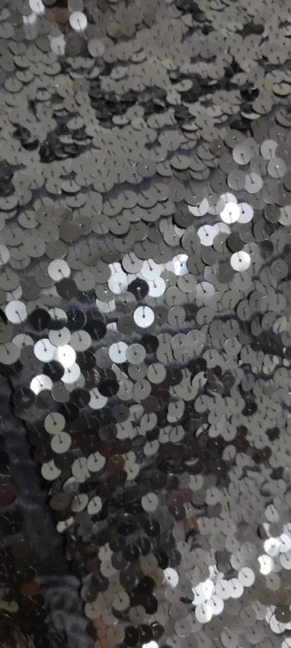 Impactante vestido midi de fiesta con diseño "color block" en dos tonos! 🖤🤍 Diseño: Estilo bicolor vertical que estiliza mucho la figura: mitad lentejuelas negras, mitad lentejuelas plateadas/blancas. Corte: Cuello en pico (V), manga corta abullonada con hombreras sutiles y una elegante apertura lateral en la falda. Talla: L (EUR) / 30 (MEX). Medidas: Largo total: Aprox. 128 cm. Ancho (sisa/cintura): Aprox. 45 cm (el tejido es elástico). Estado: Nuevo con etiqueta (se ve el precinto en las fotos). Ocasión: Perfecto para Nochevieja, bodas de noche, graduaciones o eventos de gala. Es una prenda que no necesita accesorios