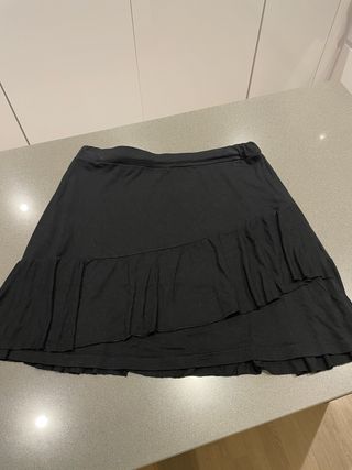 Falda corta negra con un diseño moderno y femenino. Ideal para combinar con diferentes estilos. - Detalle de volantes en cascada. - Cintura elástica para mayor comodidad. - Tejido suave y ligero.