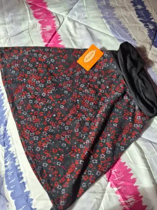 Falda con estampado floral en tonos negro, rojo y gris. El tejido es suave y ligero. - Diseño de flores pequeñas. - Cintura elástica. - Corte acampanado. Entrego zona metro poble sec.