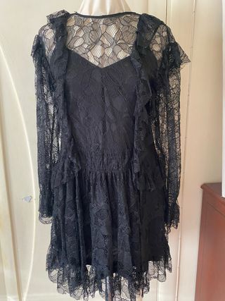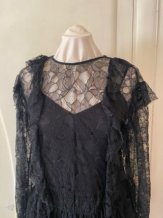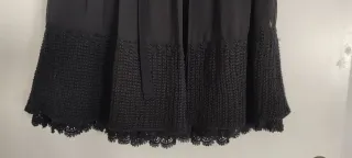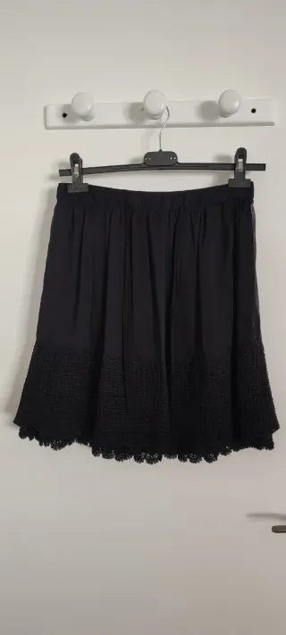 Falda negra con bonito detalle de encaje en el bajo y con forro. Es una prenda sin estrenar. - Diseño con vuelo. - Cintura elástica. - Bajo con detalle de encaje. - Tejido ligero.