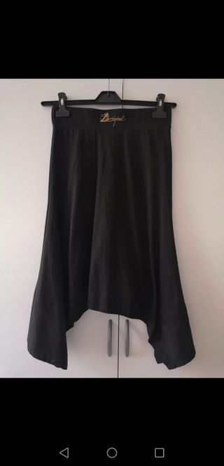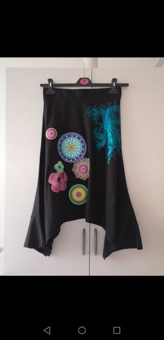 Falda negra con estampados de flores y círculos. Como se ve en las fotos la parte de abajo no es recta, es más larga en los lados. Marca Desigual. Talla S, aunque puede valer a quien tenga una M porque la cintura es elástica. En perfecto estado, solo la he usado una vez un rato, aún conservo la etiqueta, su precio en tienda era de 59€