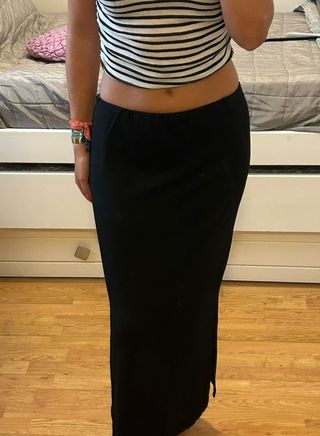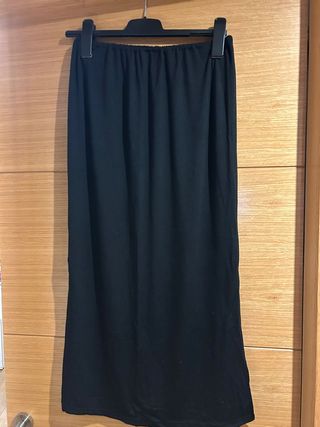 Falda midi larga negra con raja en el lateral. Cintura elástica con detalle de nudito en la cintura. Con mucha caida y fresca.