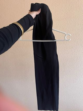 Vestido negro de corte elegante, ideal para ocasiones especiales. Su diseño combina sofisticación y estilo. - Tejido con textura. - Mangas tres cuartos con detalle de satén. - Cintura elástica. - Falda larga. Contorno cintura: 68 cm Contorno de pecho: 70 cm