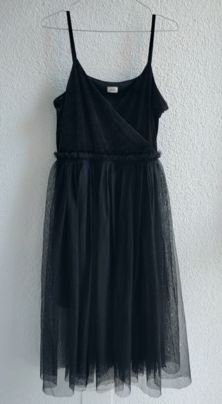Precioso vestido negro con cuerpo de terciopelo y falda de gasa y rejilla. El cuerpo tiene escote cruzado, y tirantes finos. La falda tiene mucho vuelo y el toque de la rejilla de horganza. Cintura elástica, se adapta perfectamente. Ideal para ocasiones especiales como Fin de año, o bodas. Cierra en el lateral con cremallera invisible